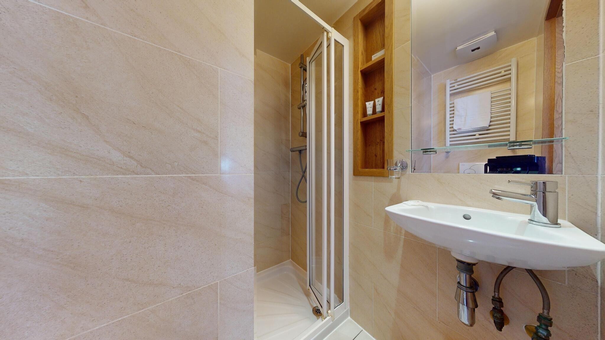 A split-level studio with a separate kitchen, en-suite shower/WC and summer A/C, located on the quiet ground floor with a private patio. Includes fast fibre-optic WiFi, digital TV/Sky, shared laundry facilities and access to landscaped gardens. All bills—electricity, water and heating—are included.