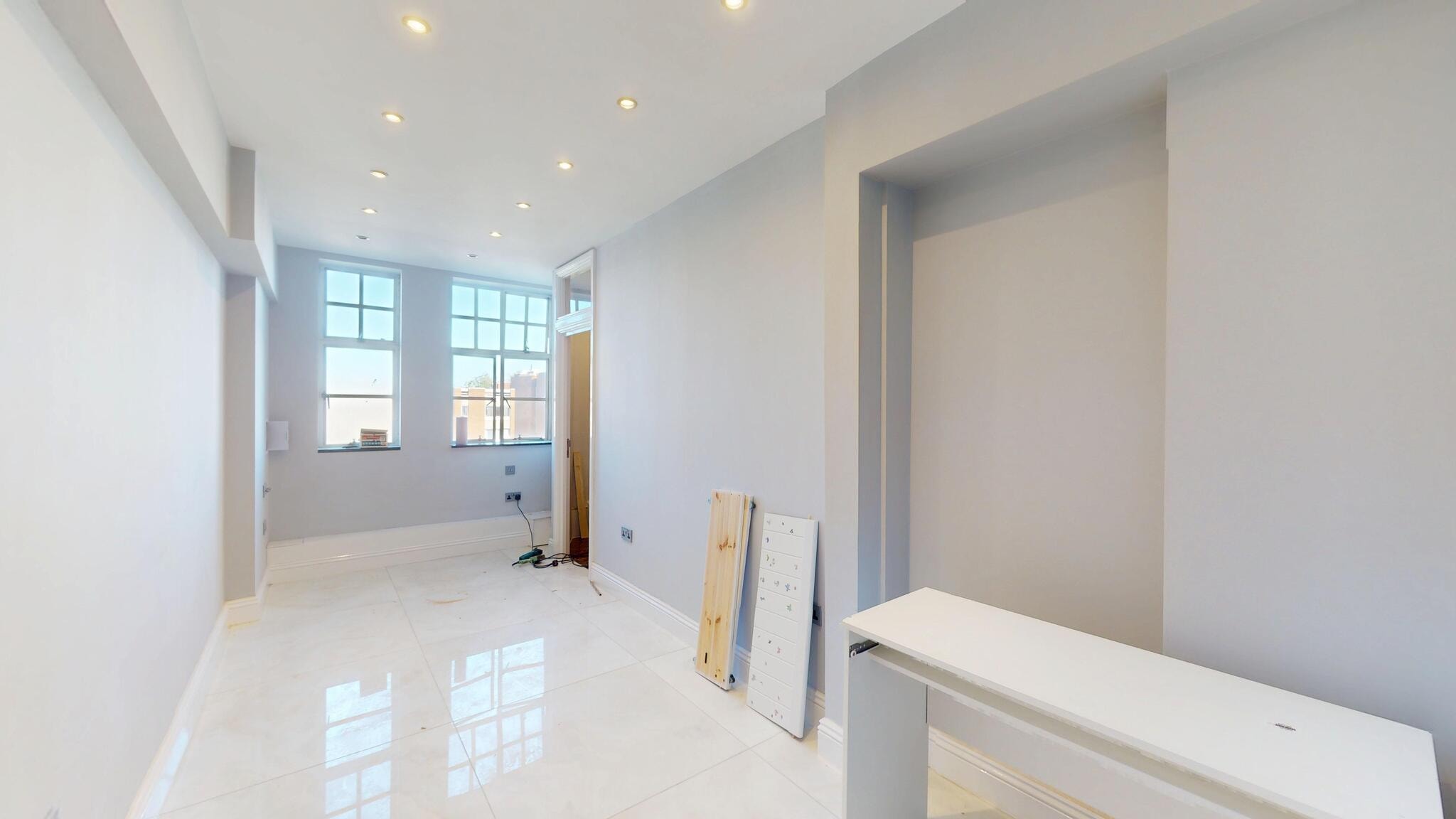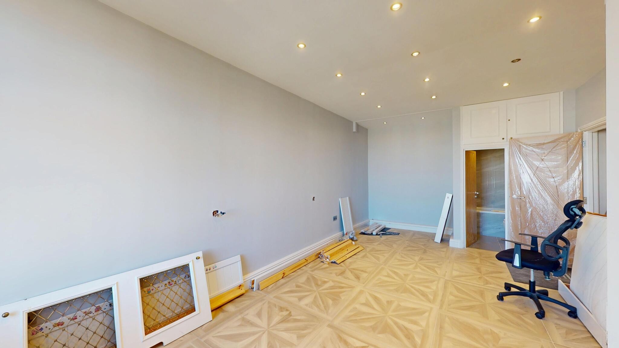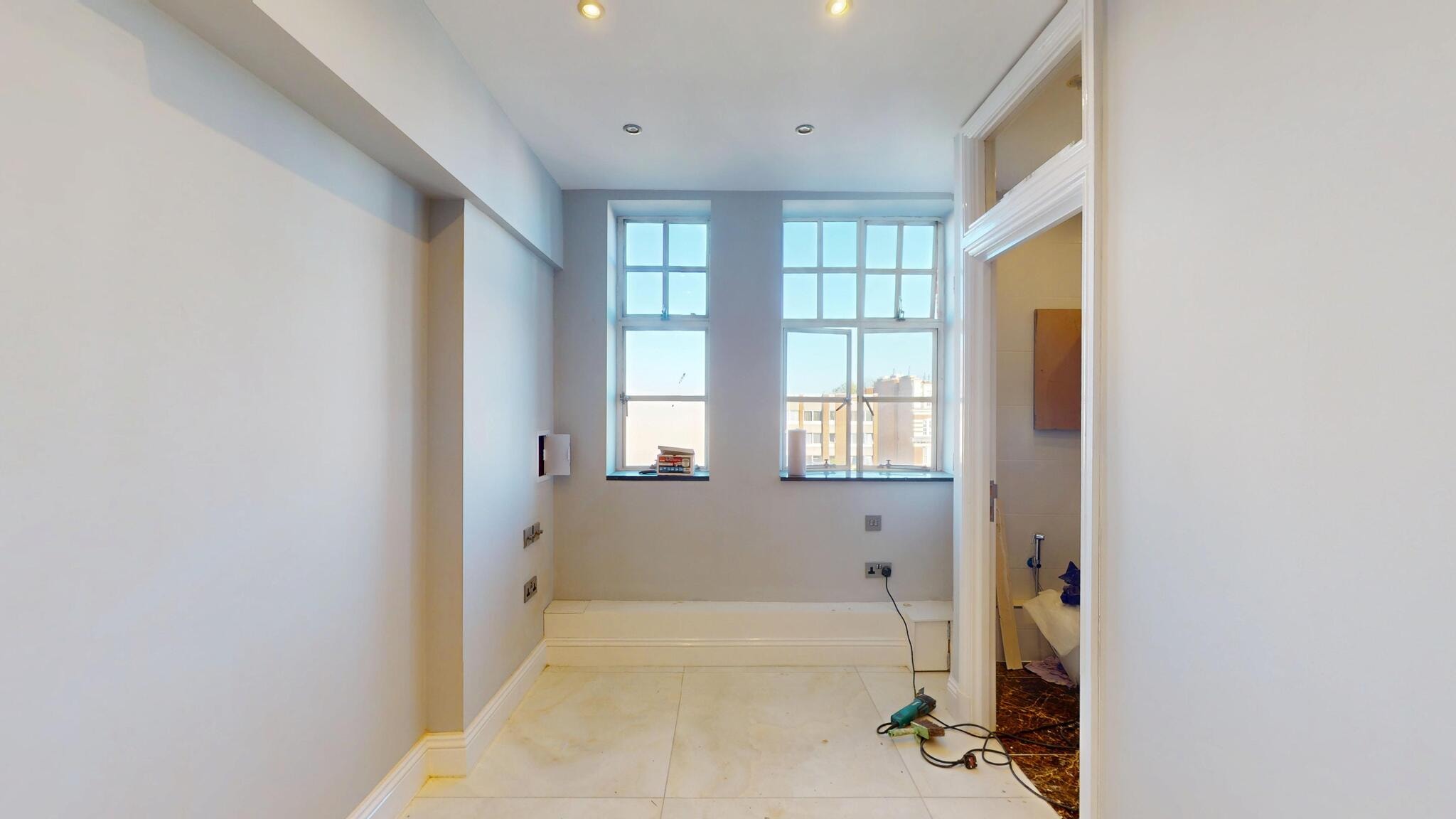Situated on the seventh floor and covering approximately 975 square feet, the flat features high ceilings and large windows that flood the space with natural light. Residents will enjoy stunning views as well as access to a peaceful communal garden.