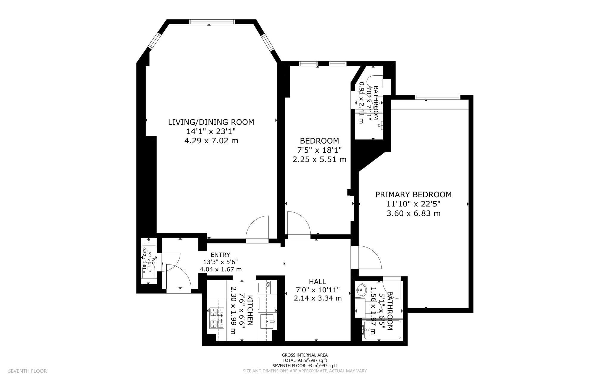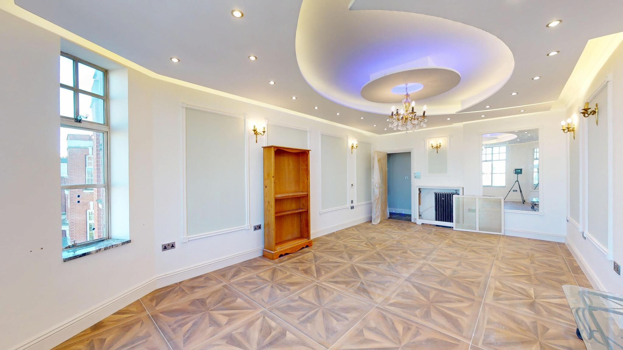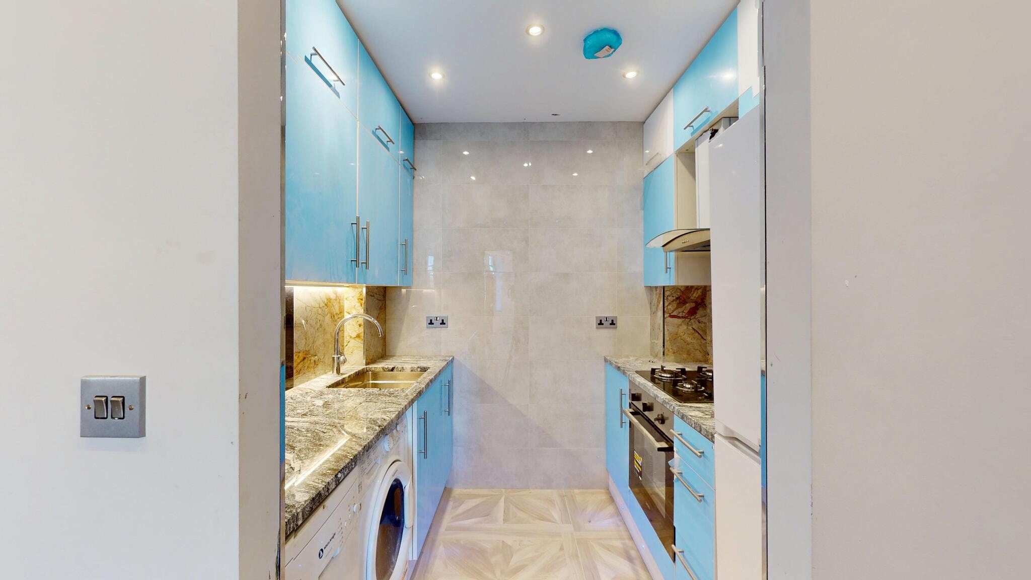 Situated on the seventh floor and covering approximately 975 square feet, the flat features high ceilings and large windows that flood the space with natural light. Residents will enjoy stunning views as well as access to a peaceful communal garden.