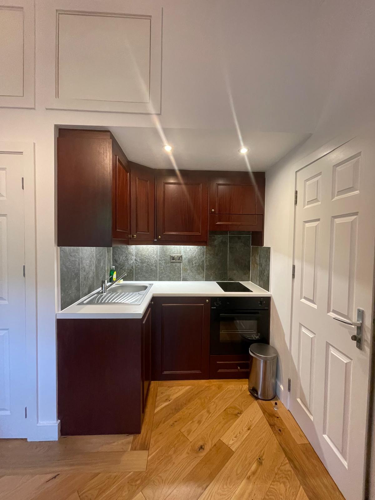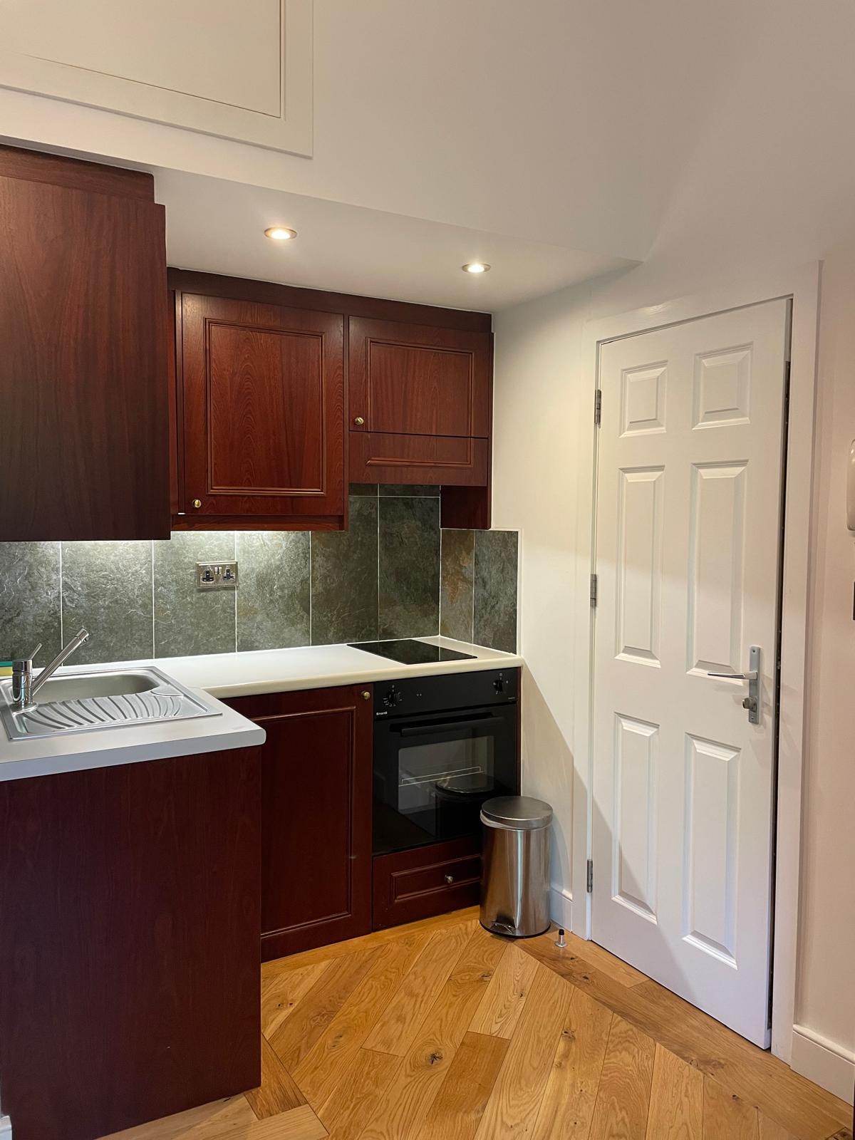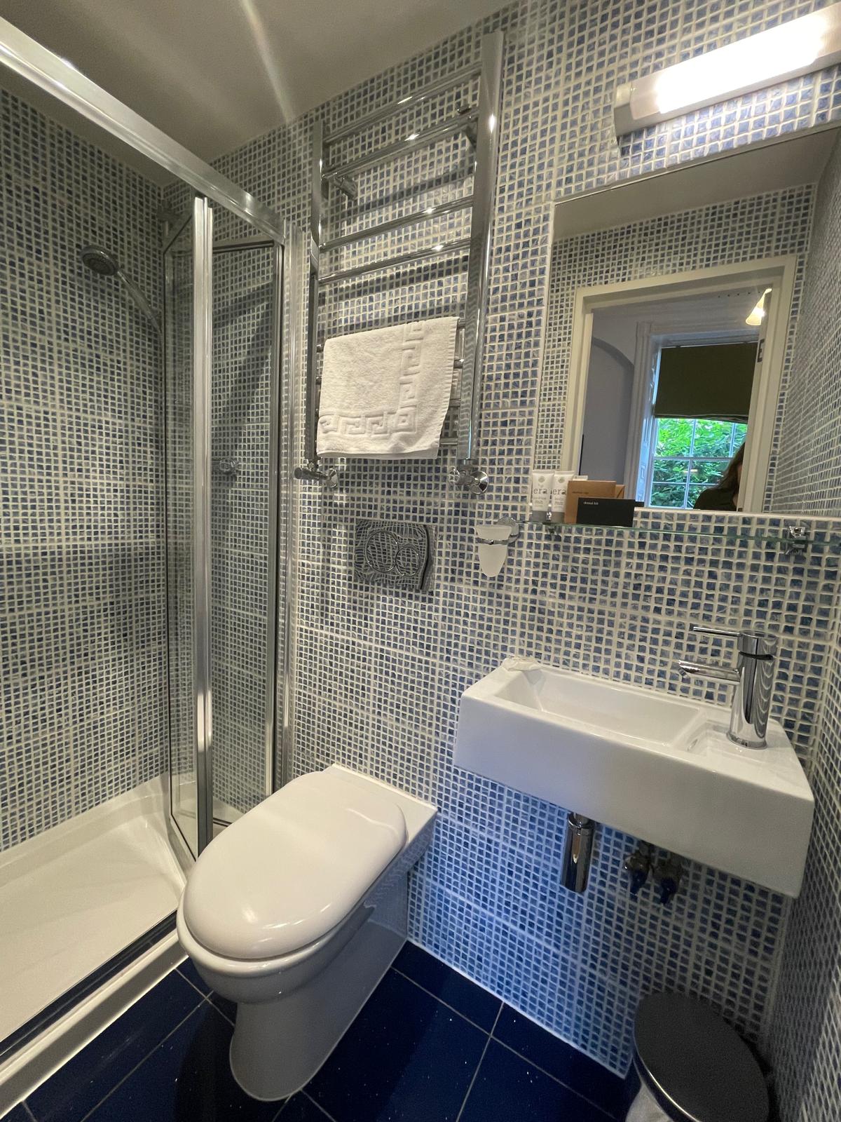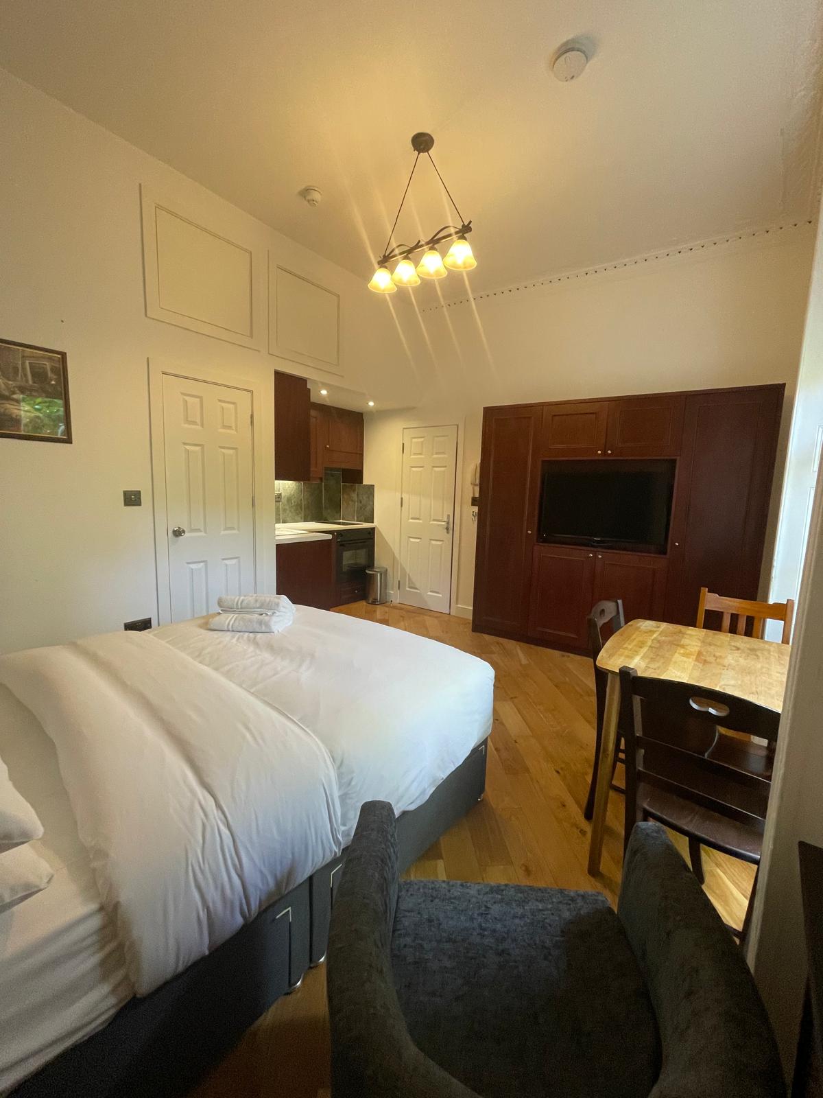 Self-contained with open plan kitchen including oven, cooker, fridge, freezer, and microwave. En-suite shower room with heated towel rail.